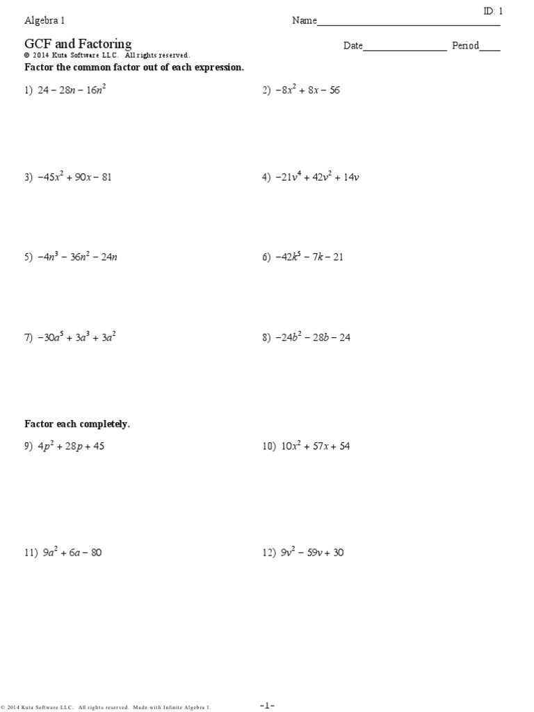 Factoring Worksheets Algebra 1. Factoring Gcf Worksheet. Common Factors Worksheet. Factoring Practice Worksheet Help your students become the greatest at finding the greatest common factor with two pages of problems this sixth grade math worksheet provides extensive practice...