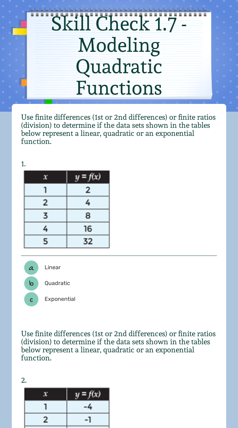 Choosing the proper quadratic modeling function for a given set of data Skills Practiced This worksheet and quiz let you practice the following skills: Reading comprehension - ensure that you draw...