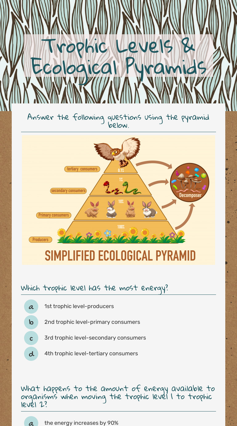 Classroom Resource Building Ecological Pyramids. Student Worksheet. Trophic levels are the levels of a food chain where the organisms at higher positions eat those directly below them. In this activity, you will be an ecologist studying the structure of the trophic levels in different vegetation...