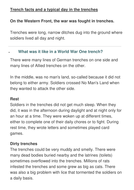 The Trenches A Worksheet explaining the facts and details of life in the trenches. Trench Diagram (A) An enlarged diagram of a trench to go with the worksheet above. Trench Diagram (B) An enlarged cross section of a trench to go with the worksheet above. Trench Definitions A matching exercise to test understanding of the components of a trench.