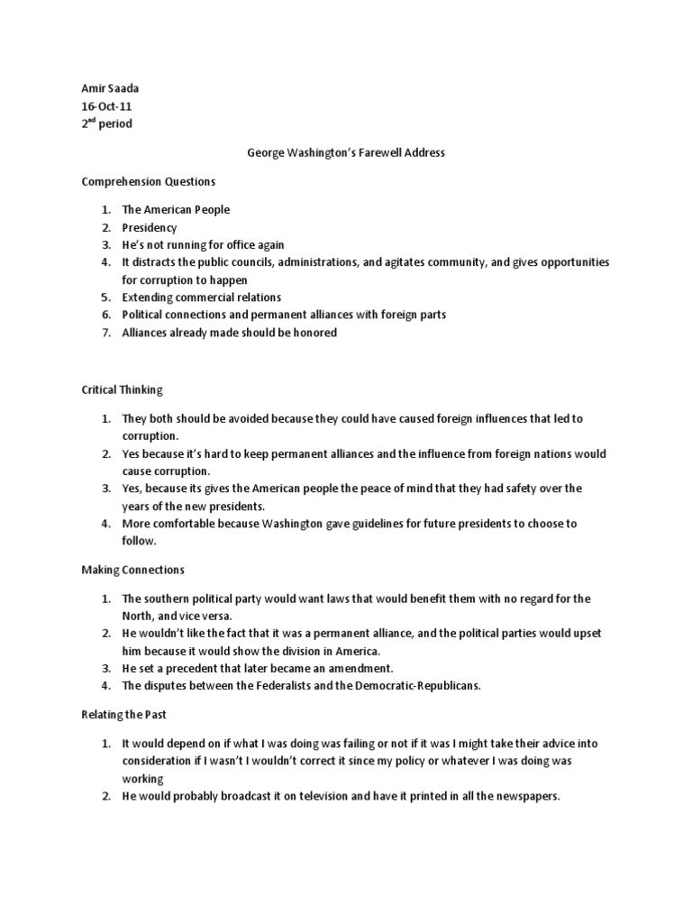 View Victoria Soltys - Washington Farewell Worksheet.pdf from HISTORY 101 at Saddle Brook Mid High Sch. Name: Date: Period: PRIMARY SOURCE: WASHINGTON'S FAREWELL ADDRESS Directions: Read the