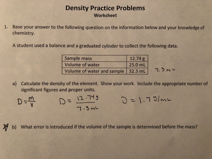 Density calculations worksheet 1. Density_calculations_worksheet.pdf - Physical Science:... A student measures the mass and volume of samples of three liquids to be as follows. Complete thechart to show the density of each liquid. Liquid Volume Mass Density A 48.5 mL 37.2 g B 12.8 mL 174.1 g C 64.7 mL 71.2 g 10. › molecular-mass-calculationsMolecular Mass Calculations - ThoughtCo Mar 11, 2019 · If you are performing calculations using a molecule that contains a specific isotope, use its mass value. This will be the sum of the masses of its protons and neutrons. For example, if all the hydrogen atoms in a molecule are replaced by deuterium , the mass for hydrogen would be 2.000, not 1.008. Density Calculations Worksheet 1 | Worksheet for Education - Pinterest Density Calculations Worksheet 1. Density Worksheet. Dec 21, 2020 - Density Calculations Worksheet 1. Density Calculations Worksheet 1. Density Worksheet. Pinterest. Today. Explore. When autocomplete results are available use up and down arrows to review and enter to select. Touch device users, explore by touch or with swipe gestures. sciencenotes.org › chemistry-worksheets-and-handoutsChemistry Worksheets and Handouts (PDF for Printing) Mar 08, 2021 · Label Parts of the Atom [Google Apps worksheet][worksheet PDF][worksheet PNG][answers PNG] Acid formulas ; Balancing equations Worksheet #1 Worksheet #2 Worksheet #3 Worksheet #4 ; Chemical and Physical Changes ; Chemistry scavenger hunt