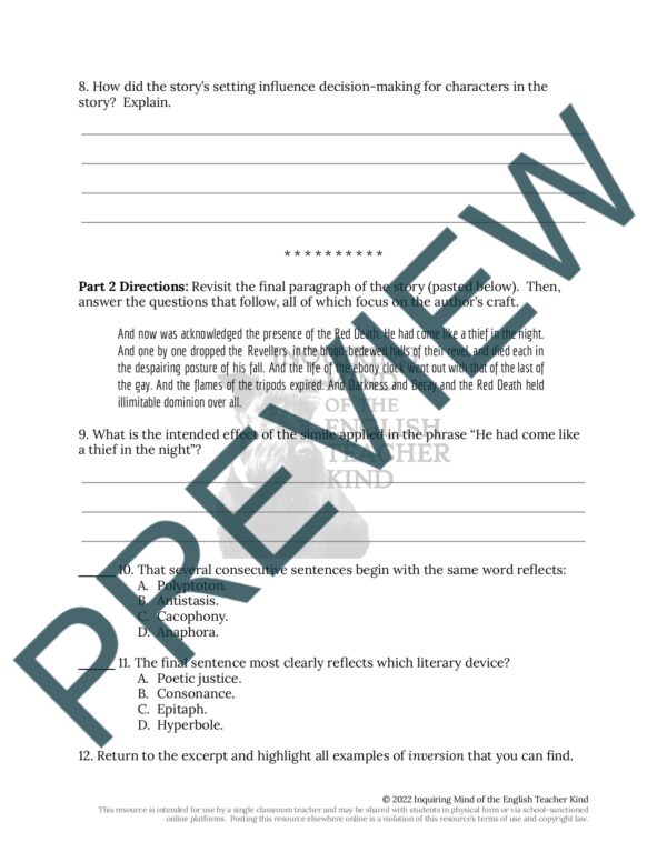 The Masque of the Red Death Quiz Poe Reading Comprehension with Answer ... Item description. This Short Story Comprehension Test Prep Quiz for the "The Masque of the Red Death" by Edgar Allan Poe uses the Common Core standards and contains QUESTIONS and ANSWERS modeled after various standardized tests. Make test prep STRESS-FREE!. WHY THIS QUIZ PACK? One of the things I struggle with the most is preparing my students for all kinds of exams that they will encounter.