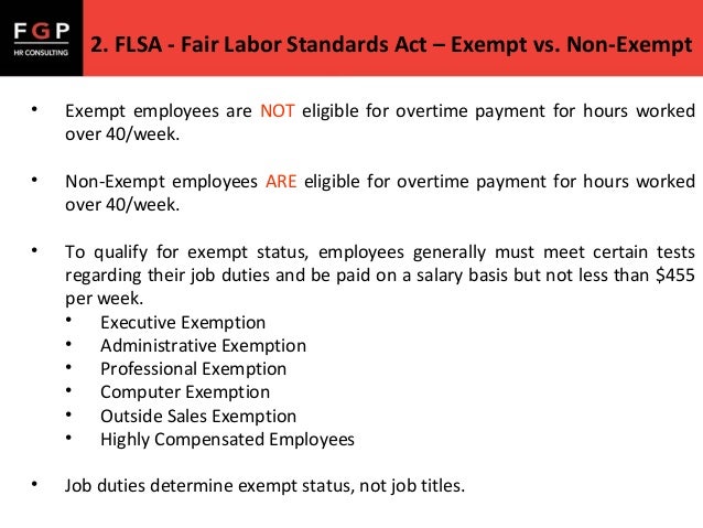 Fact Sheet #17A: Exemption for Executive, Administrative, Professional ... highly compensated employees performing office or non-manual work and paid total annual compensation of $107,432 or more (which must include at least $684 * per week paid on a salary or fee basis) are exempt from the flsa if they customarily and regularly perform at least one of the duties of an exempt executive, administrative or professional … PDF FAIR LABOR STANDARDS ACT (FLSA) QUESTIONNAIRE - Louisiana Please refer to the FLSA Index (pages 6-11 of this document) for a description of the terms in boldand referenced by a superscript. Exempt/NonExempt. - The content of this questionnaire was developed from the FLSA Regulation, Part 541: Defining and delimiting the exemptions for Executive, Administrative, Professional,