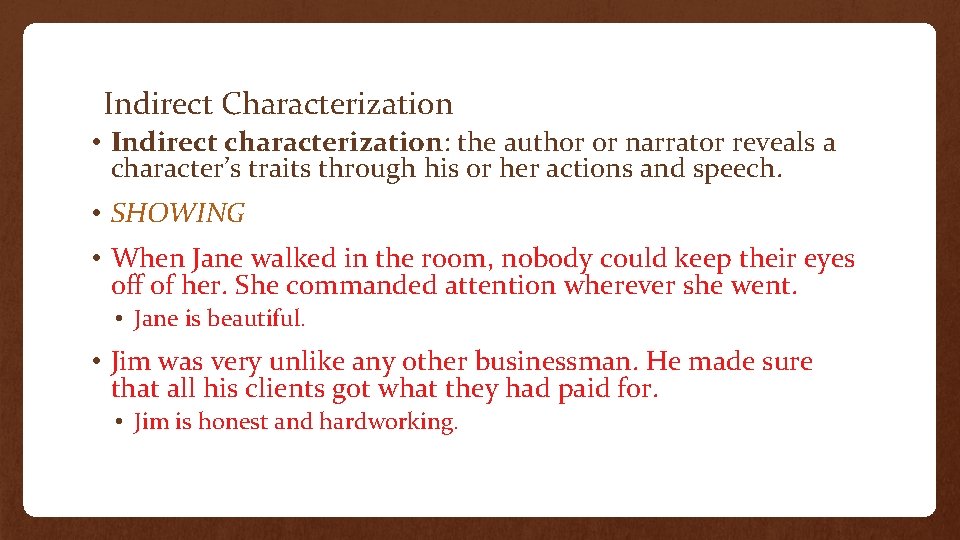 DOCX Wasatch County School District / Overview Indirect Characterization (SHOWING): The author shows the reader the traits of a character through that character's thoughts, words, and actions. The author also shows that character's traits by how other characters respond to him, including what they think and say about him. Example: Joe . sits . by his window and . yells. at . people.