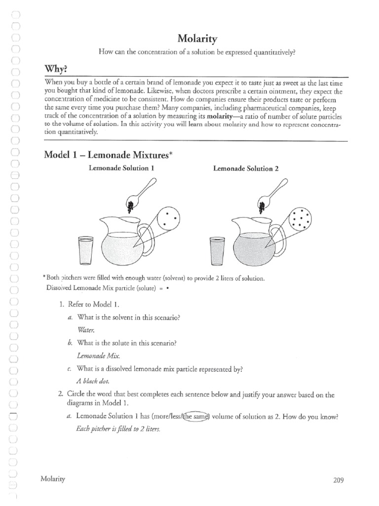 PDF Molarity problems worksheet answer key - ftha.org Molarity practice problems worksheet answer key. Solutions worksheet 2 molarity and dilution problems answer key. Which solute mass is required to prepare each of the following solutions? a. 1.00 L of 0.125 M K2SO4 21.8 g K2SO4 b. 375 mL of 0.015 M NaF 0.24 g NaF c. 500 mL of 0.350 M C6H12O6 31.5 g C6H12O6 Calculate the molarity of each of the ...