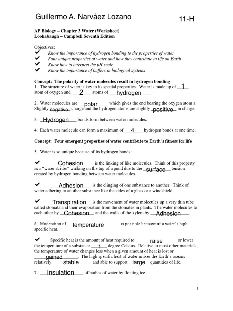 Qualitative vs. Quantitative Observations Worksheet Sep 19, 2017 · Quantitative vs Qualitative Observations. Click link for the PDF of this worksheet: Qualitative-vs-Quantititive-Observations This is a nice review sheet to practice identifying Qualitative and Quantitive observations. Qualitative (think quality) are observations you can’t really put a number on, while Quantitative (think quantity) are observations that are … Quiz & Worksheet - Properties of Water | Study.com Water has high surface tension. Water has a low specific heat. Water forms covalent bonds Water has a high specific heat. 2. Which of the following concepts help explain why water can travel up a... Get Amoeba Sisters Properties Of Water Worksheet Answer Key Get the Amoeba Sisters Properties Of Water Worksheet Answer Key you require. Open it using the cloud-based editor and begin editing. Complete the blank fields; engaged parties names, addresses and numbers etc. Change the template with exclusive fillable fields. Put the date and place your e-signature. Properties of water what makes water so special worksheet answer key What makes water so special work should and sulky properties of water, perties water that makes water so special that makes water source special or first it is polar, solvent attacks, polar solvent. Second, almost all compound. Almost all compound gets dissolved in water dissolved in water.