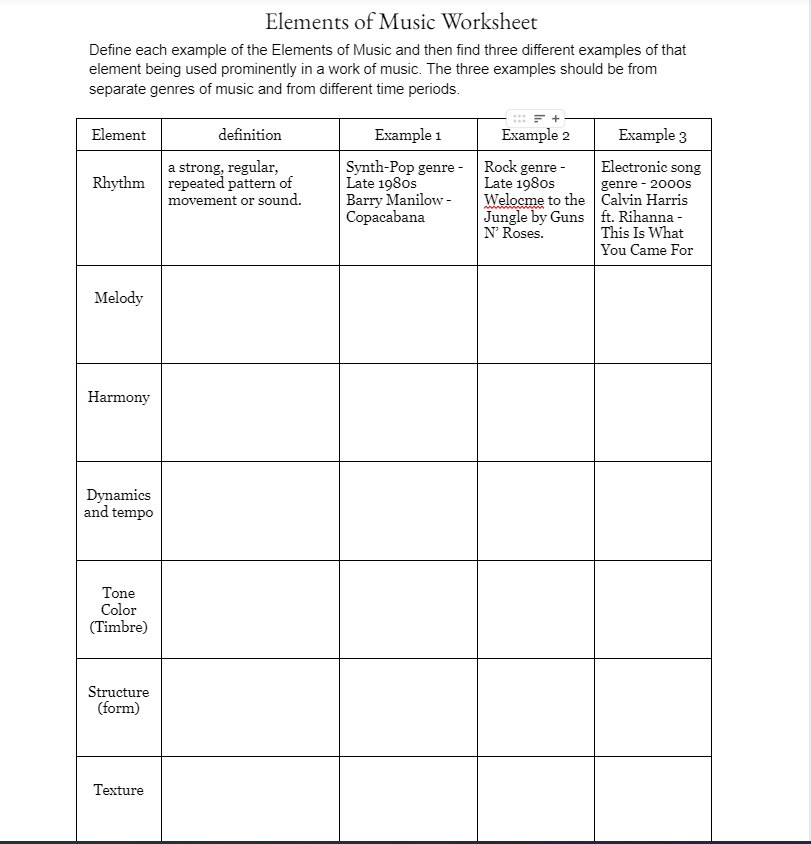 Elements Of Music Worksheet Teaching Resources | TPT - TeachersPayTeachers Elements of Music Definition Worksheets Bundle by Jooya Teaching Resources 4.4 (5) $36.00 $28.95 Bundle This collection of Elements of Music Definitions Worksheets Bundle is a versatile printable product that will help you teach music terminology for the Elements of Music.
