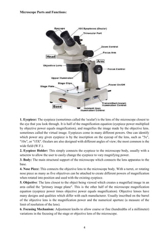 DOC Microscope Parts and Functions - birdvilleschools.net Microscope Parts and Functions Eyepiece— where you look into the microscope Body Tube— light passes from the objective lens to the eyepiece through this part of the microscope Nosepiece— where the objective lenses are mounted Objective lenses— there may be 2 or 3 of these mounted on the nosepiece. Each one magnifies a different power Arm—