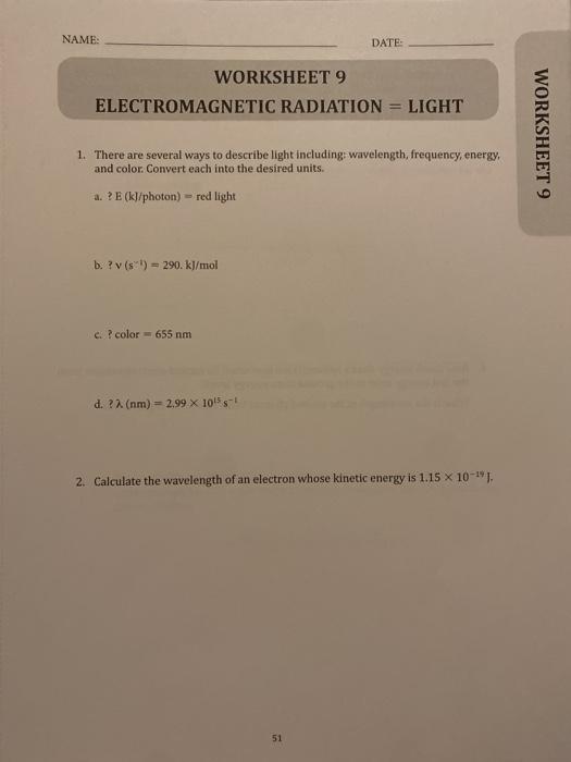 Wavelength, frequency, & energy of electromagnetic waves Chemistry Worksheet – Wavelength, frequency, & energy of electromagnetic waves. Show ALL equations, work, units, and significant figures in performing. WavelengthFrequencyEnergyand KEY.doc - LIGHT WORKSHEET View WavelengthFrequencyEnergyand KEY.doc from CHE 131 at Stony Brook University. LIGHT WORKSHEET, WAVELENGTH, FREQUENCY AND ENERGY Color Red Orange Yellow ...