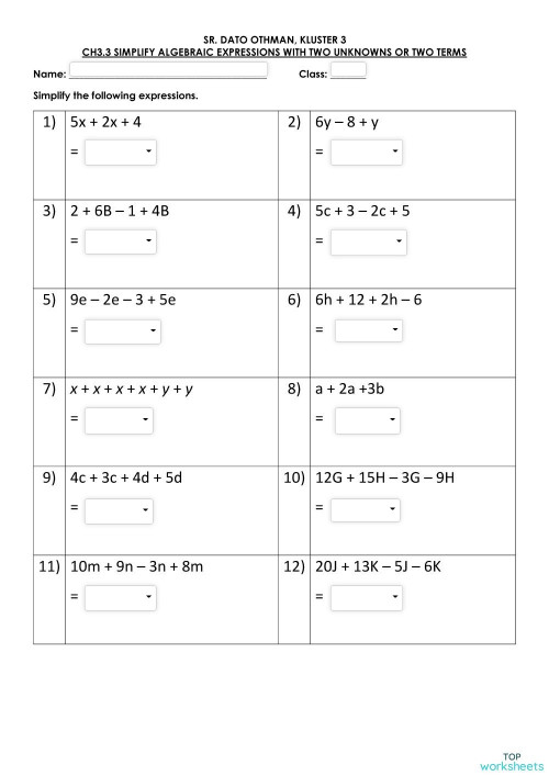 Combining Like Terms Worksheets - Easy Teacher Worksheets Your students will use this collection of activity worksheets to learn how to solve for variables to simplify algebraic expressions. These sets of worksheets introduce your students to the concept of combining like terms, and provide examples, short practice sets, longer sets of questions, and quizzes. This is a paramount skill in algebra, you ...